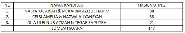 Setelah pembacaan visi misi dan program kerja telah selesai, maka acara yang utama pun segera di mulai, dimukai dari Mc untuk mempersilahkan bapak/ibu guru untuk mengambil surat suara dan memilih salah satu kandidiat dibillik tempat pemungutan suara, dan dilanjut MC membacakan absen sesuai kelasnya masing-masing untuk mengambil surat suara dan memilih salah satu kandidiat yang menurutnya terbaik dibilik tempat pemungutan suara. Setelah satu jam berlangsung, acara pemungutan suara pun selesai dilaksanakan. setelah para panitia perhitungkan suara, didapatkan hasil sebagai berikut :